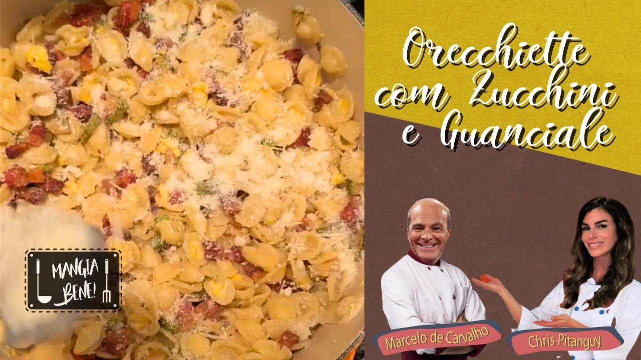 Ingredientes: Modo de preparo: Primeiro frite o guanciale e reserve-o mas deixe uma pequena porção na panela, adicione o vinho branco e a abobrinha, misture