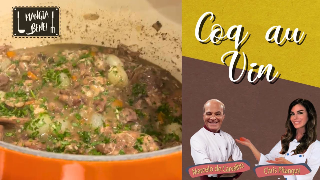 Coq au Vin | Mangia Bene Ingredientes: Modo de preparo: Em uma vasilha coloque os pedaços de frango, o vinho tinto, a cenoura picadinha, folhas