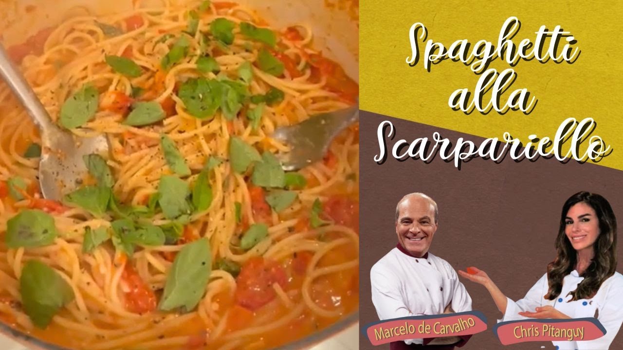 Ingredientes: Tomate cereja; Alho; Queijo pecorino ralado; Pimenta dedo de moça; Pimenta do reino (de moer); Manjericão; Azeite de oliva; Sal; Spaghetti; Para salada: Couve